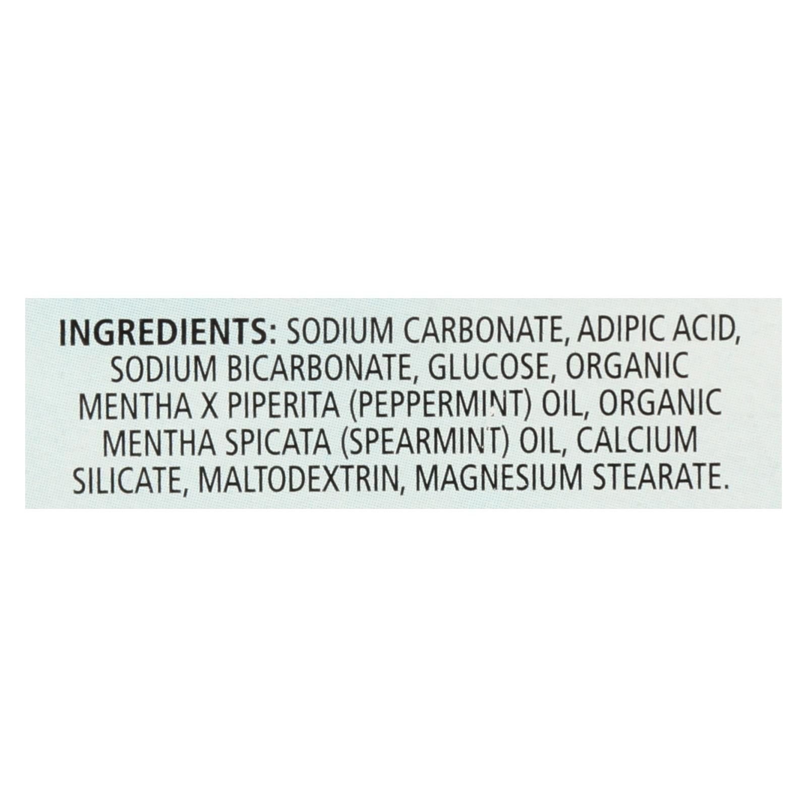 ingredients : sodium carbonate;adipic acid;sodium bicarbonate;glucose;organic mentha x piperita;peppermint;oil;organic mentha spicata;spearmint;calcium silicate;maltodextrin;magnesium stearate