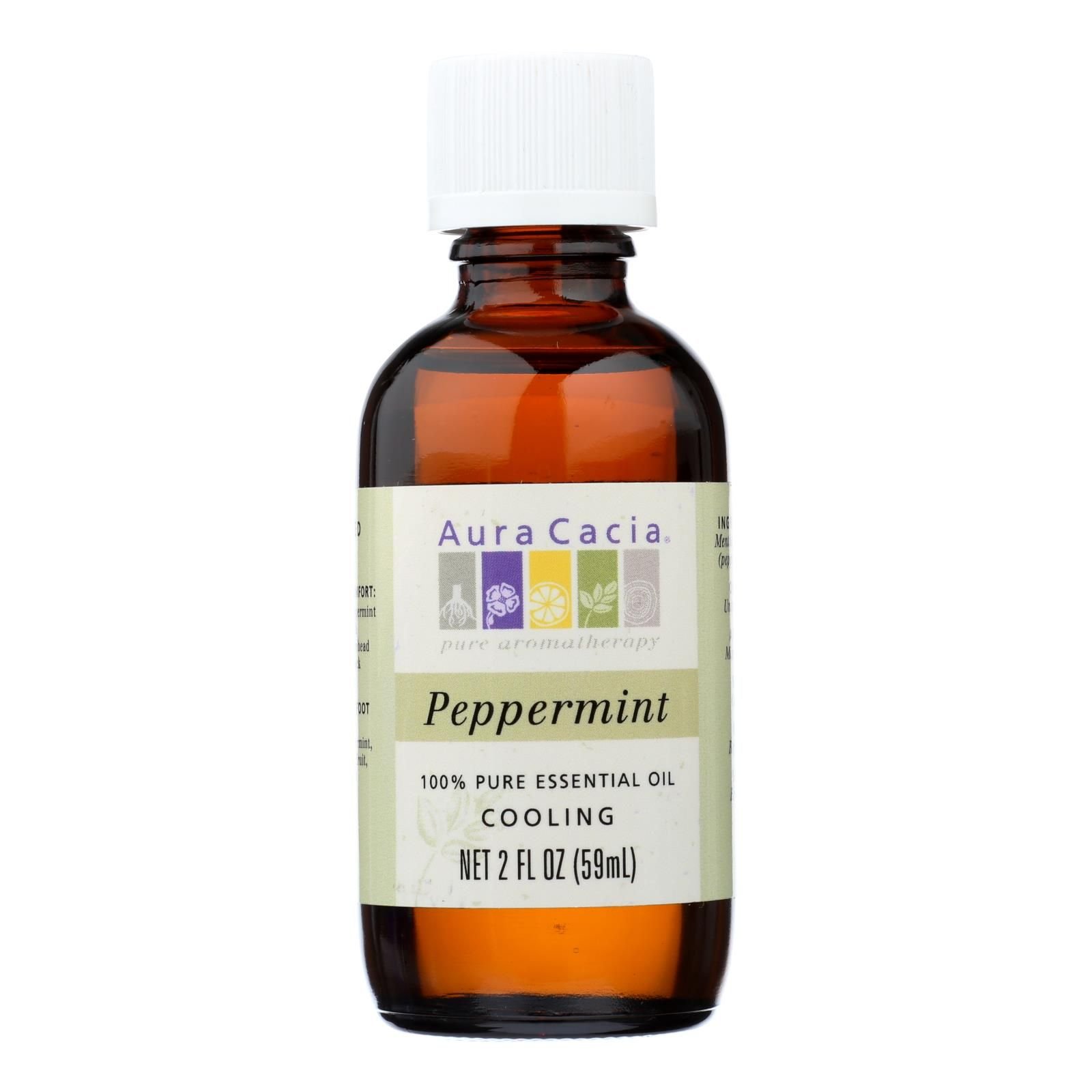 Aura cacia peppermint essential oil has a minty, fresh aroma. This 100% pure essential oil is perfect for cooling the body, refreshing the mind and renewing the spirit. The suggested uses for this oil are on a cooling, comfort cloth and for a foot massage. Each bottle of aura cacia peppermint essential oil contains 2 fl. Oz. Of product. See label for warnings.