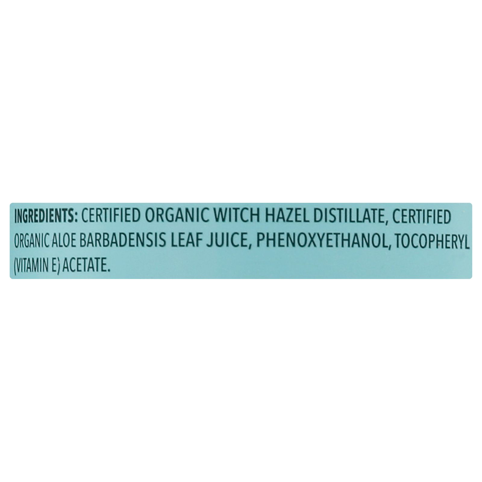 ingredients : certified organic witch hazel distillate;certified organic aloe barbadensis leaf juice;phenoxyethanol;tocopheryl (vitamin e) acetate